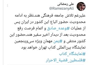 علی رمضانی قائممقام و سخنگوی سیوپنجمین نمایشگاه بینالمللی کتاب تهران، در پیامی در حساب کاربری خود در فضای مجازی نوشت: یمن میهمان ویژه سیوپنجمین نمایشگاه بینالمللی کتاب تهران خواهد بود. به گزارش ستاد خبری سیوپنجمین نمایشگاه بینالمللی کتاب تهران، علی رمضانی قائممقام و سخنگوی سیوپنجمین نمایشگاه بینالمللی کتاب تهران، در پیامی در حساب کاربری خود در فضای مجازی نوشت: «علیرغم تلاش جامعه فرهنگی هند، نظر به ادامه محدودیت حضور اتباع این کشور در ایران پس از عملیات وعده صادق و ...