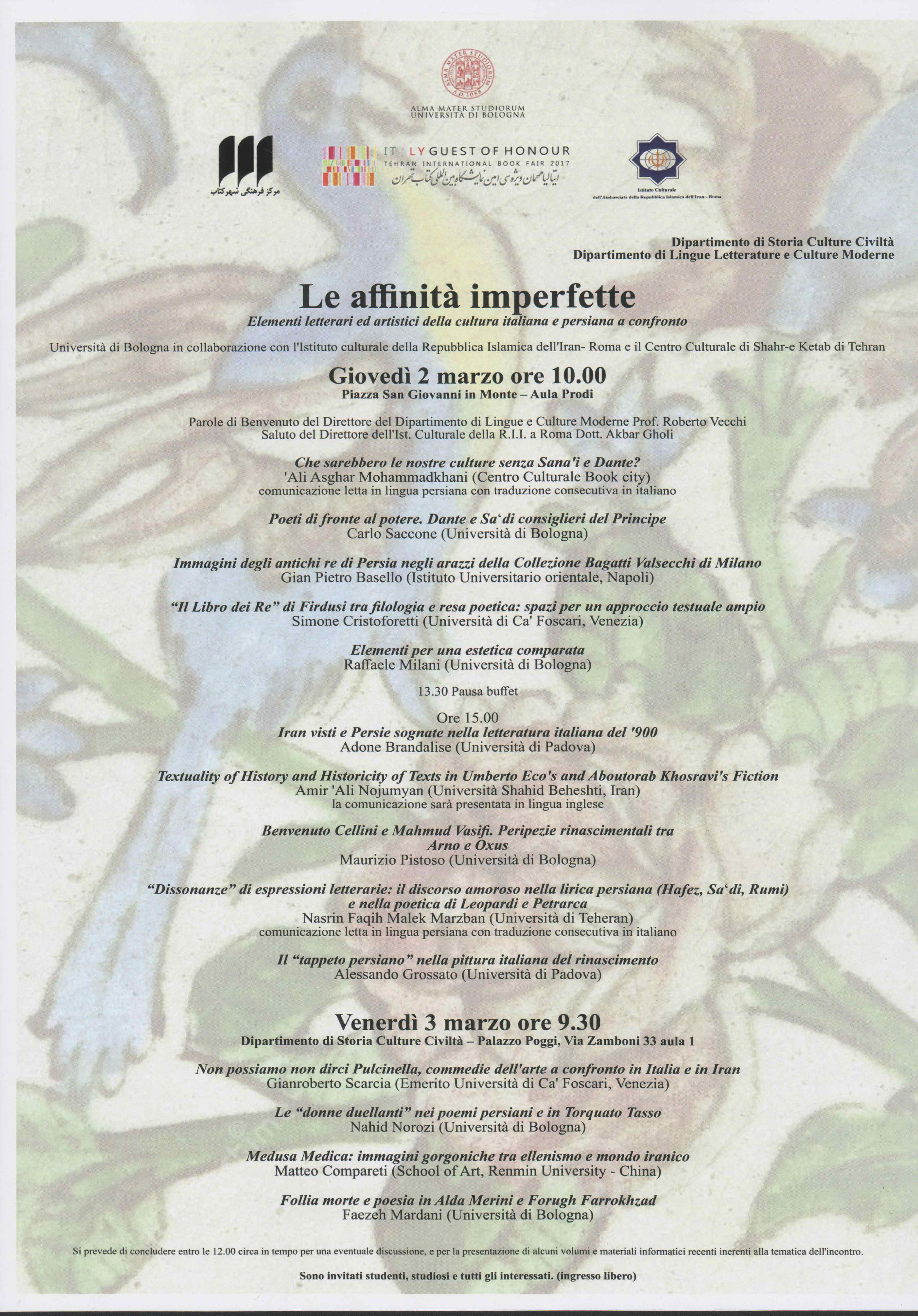 Iran and Italy held a literature conference entitled "Imperfect Affinities" on March 2 and 3 at University of Bologna. This conference has been held with the cooperation of Book City Cultural Center and Cultural Center of the Islamic Republic of Iran in Italy. Considering the fact that Italy is the guest of honor at the 30th Tehran International Book Fair, the subject of this conference was about comparative analyses of Iran and Italy literature.