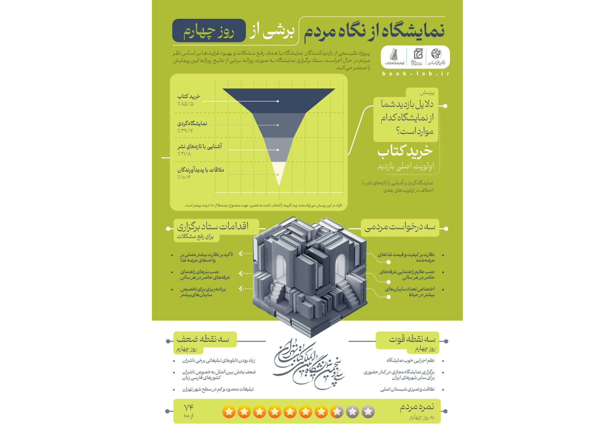 مخاطبان سیوپنجمین نمایشگاه بینالمللی کتاب تهران در نظرسنجی چهارمین روز برگزاری این رویداد بزرگ فرهنگی و ادبی کشور، اعلام کردند برای خرید کتاب، گردشگری، آشنایی با تازههای نشر و دیدار با پدیدآورندگان آثار به نمایشگاه کتاب آمدهاند. به گزارش ستاد خبری سیوپنجمین نمایشگاه بینالمللی کتاب تهران، پروژه نظرسنجی از بازدیدکنندگان نمایشگاه با هدف رفع مشکلات و بهبود فرآیندها، براساس نظر مردم در حال اجراست. ستاد برگزاری نمایشگاه به صورت روزانه برشی از نتایج روزانه این پیمایش را منتشر میکند و طبق ...