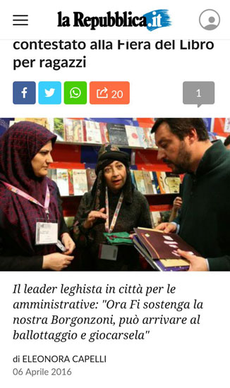 یکی از نمايندگان جنجالي پارلمان ايتاليا از غرفه موسسه نمایشگاه های فرهنگی ایران که به نمایندگی از نشر جمهوری اسلامی ایران در نمایشگاه کتاب بلونیا شرکت نموده است بازدید کرد. به گزارش روابط عمومی موسسه نمایشگاه های فرهنگی ایران، روز گذشته سالوینی نماینده جنجالی پارلمان ایتالیا از غرفه ایران در نمایشگاه کتاب بلوینا بازدید کرد. حضور وي در همه مناسبت ها همواره با اتفاقات خاص همراه است. سالوینی  با حضور خارجيها در ايتاليا موافق نيست و همين امر موجب انتقادات ...